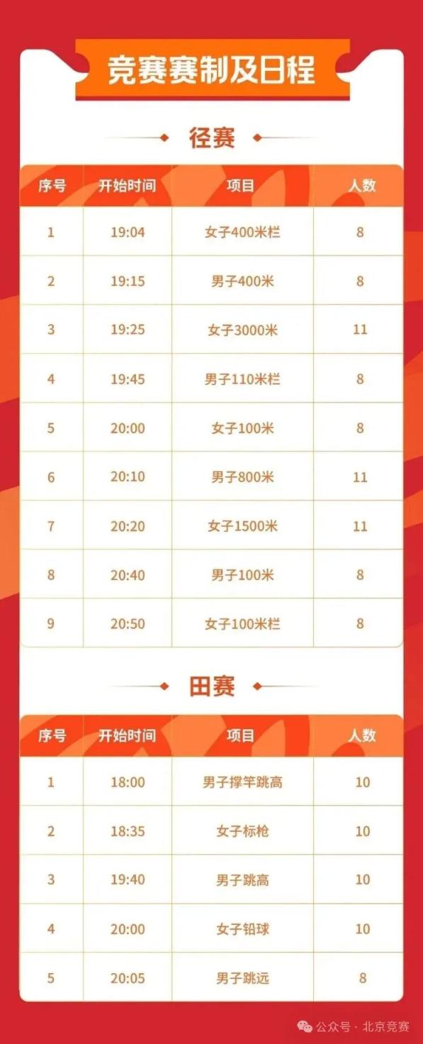 率先开赛的男子撑竿跳高项目中,两位中国选手——今年先后跳过5.85米,现为全国纪录共享者的黄博凯和李晨洋,将与菲律宾名将、奥运亚军、亚洲纪录保持者欧比埃同场较量。三名美国好手丹尼尔、沃尔什和托尼的加入,让这场高空对决更具看点。